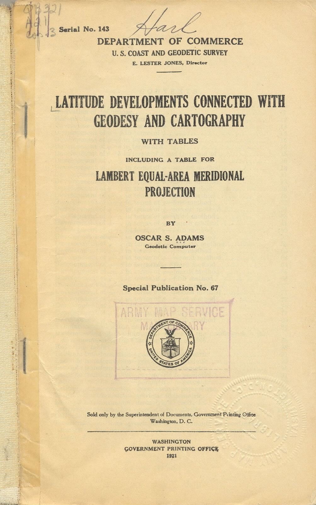 In the theory of map projections based on the ellipsoid model of the earth, several quantities akin to latitude are defined. The version used by geographers and cartographers is “geodetic latitude” (ϕ), but these others (θ, ψ, χ, β, ω) provide the theorist and algorithm developer with the right way to think about the spacing of the parallels for various map projections. They have other purposes as well. They are all zero at the equator and ±90° at the poles. A plot of the difference of two of these latitudes versus one of them strongly suggests the idea of fitting this relationship to a series of the form a where k is an even number that indexes the summation. This has been done since the 1920s in the work of Oscar Adams, who obviously worked by hand. Now, with the help of Mathematica, many more coefficients a can be computed, both numerically and symbolically, and more accurately. The choices of methods are (1) a series in powers of the ellipsoid’s eccentricity, and (2) a previously problematic numerical integration. A nifty algorithm for the transverse Mercator map projection requires many a for the formula between conformal latitude and meridional rectifying latitude. This algorithm could not have been developed before the advent of symbolic manipulation of series, like Mathematica provides.